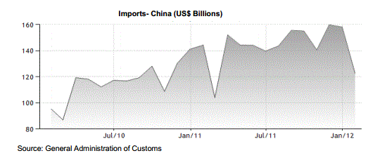 With the rate of growth in both exports and imports declining in recent months, it is clear that the slowdown is evident economy wide. While the government has reduced its GDP target for 2012 to only 7.5%, the government retains scope to stimulate the economy via monetary or fiscal policy initiatives if growth does slow by more than anticipated.