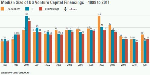 The median size of all venture capital financings increased from $4.4 million in 2010 to $5.0 million in 2011, reversing three consecutive annual declines, although the median financing size in 2011 was still lower than the figure for each year in the period from 1999 to 2008. The median financing size for life sciences companies increased from $5.0 million in 2010 to $6.0 million in 2011, its highest level since 2008. For information technology companies, the median financing size declined again, from $5.0 million to $4.7 million, representing the lowest median financing size since at least 1998. The steady decline in the median financing size for information technology companies partly reflects the ability of many technology companies to commence operations with lower levels of funding than historically required, due to various technological advances.