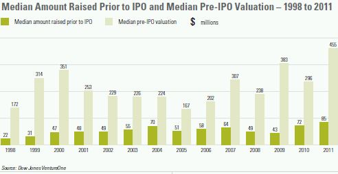 The ratio of pre-IPO valuations to the median amount raised prior to IPO by venture-backed companies going public increased to 5.4:1 in 2011 from 4.1:1 in 2010—the second-highest level since 2000 (a higher ratio means higher returns to pre-IPO investors). This ratio was between 3.1:1 and 5.3:1 for each year from 2001 to 2008. In contrast, this ratio ranged from 7.7:1 to 10.0:1 from 1997 to 2000, due to very large pre-IPO valuations by younger companies, and spiked temporarily to 8.9:1 in 2009 based on a very small sample size of VC-backed IPOs that year.