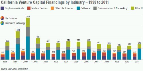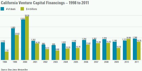 Roughly four times the size of the next-largest venture capital market in the United States, California was responsible for 42% of the nation's financing transactions in 2011. The year's deal tally was the largest ever achieved in