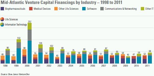 The percentage of all mid-Atlantic financings completed by information technology companies increased from 36% in 2010 to 39% in 2011. The region's life sciences sector—which had outpaced the information technology sector in 2009—saw its market share inch up from 29% to 30%.