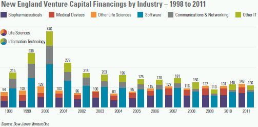 New England continues to be a leading center of activity for technology and life sciences companies. In 2011, the number of financings by life sciences companies edged out the number of financings by information technology companies, as the two sectors swapped places in the rankings again. Information technology companies accounted for 33% of New England's venture capital financings in 2011 (down from 37% in 2010) and life sciences companies contributed 36% of the region's financings (up from 35%).