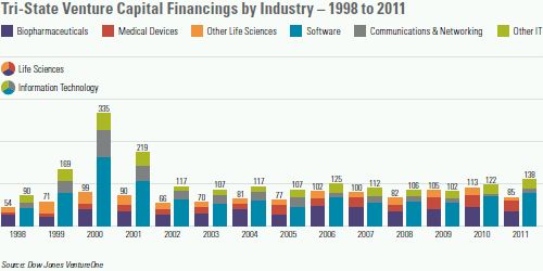 Information technology companies garnered the largest share of the tri-state region's VC financing market in 2011, with 28% of the region's financings, up from 25% in 2010. Life sciences companies, after leading the tri-state region's rankings in 2009, accounted for only 17% of the region's financings in 2011, down from 24% in the prior year.