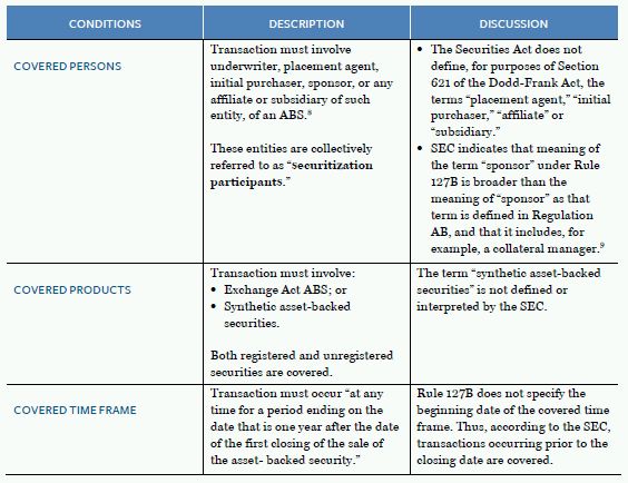 The very broad scope of Section 621 of the Dodd- Frank Act caused concern among many market participants that the SEC would propose a conflicts-of-interest rule that prohibits many common practices in ABS transactions. Although several aspects of Rule 127B are likely to draw heavy comment, Rule 127B and the related interpretive guidance indicate a clear intention on the part of the SEC to craft a rule that is narrowly tailored and designed to prohibit only those types of conflicts that are of particular concern to the SEC.