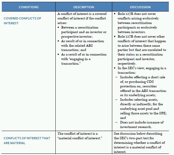 - Rule 127B prohibits a securitization participant (i.e., an underwriter, placement agent, initial purchaser, sponsor or any affiliate or subsidiary of any such party) from engaging in a transaction that would result in a "material conflict of interest" with respect to an investor.