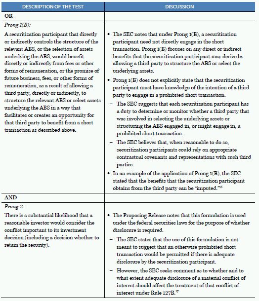 16 See Example 4B in the Proposing Release at pp. 74-75. In that example, the SEC states that "[a]lthough the securitization participant [in that example] would not receive direct compensation for facilitating the short transaction we believe it would be appropriate to impute a benefit to the securitization participant for creating the opportunity for the third party to profit from its short transaction. For example, the securitization participant may receive compensation from its role in connection with the ABS or compensation from future business that the third party promises to direct to the securitization participant." Id. at 75. It is unclear whether the SEC would impute a benefit to the securitization participant in circumstances where such a promise by a third party was not made.