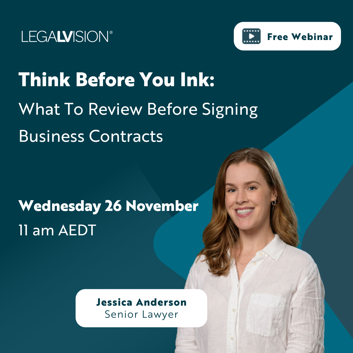 Join us for our free webinar, Think Before You Ink: What To Review Before Signing Business Contracts, with LegalVision’s Jessica Anderson.