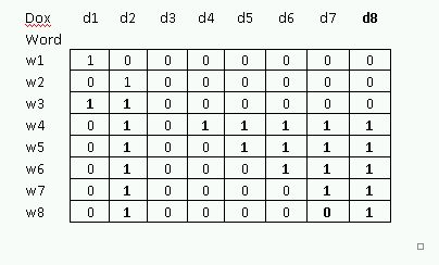 Let's stick with key words for a moment. Key words approach a document collection in a simplistic way; either a document contains the key word (or a variation of it) or it does not contain that word. Let's say we have only two key words, w1 and w2, for our query, and that we find w1 in document 1, which we'll call d1, and w2 in document 2, or d2; but we do not find w1 in d2 and we do not find w2 in d1. In the four-square box at the end of this sentence, a "1" means that the word in question is present, while a "0" means that the same word is not present: