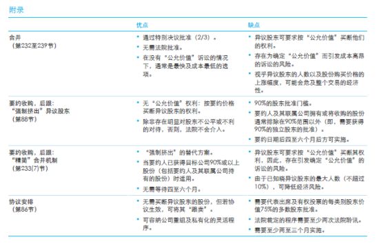 最近已利用公司法第十六部分(经修订,下文简称"法律")中 的法定合并机制完成多项私有化交易。但是,由于异议股东在合 并后提起诉讼,部分客户考虑采用其他方法实现相同的目的。存 在其他两种方法:法律第86节下的协议安排以及法律第88节下的 要约收购和"强制挤出"。
