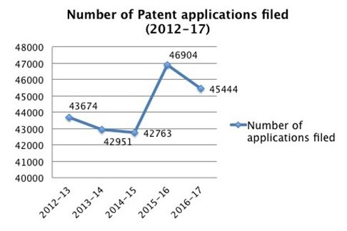 The filing of applications has remained more or less the same with justa 4% increase since 2012-13 (from 43,674 applications filed in 2012-13 to 45,444 applications files in 2016-17). However, while the number of applications filed decreased by 3% from 2015-16 (46,904 applications) to 2016-17 (45,444 applications), the real growth can be witnessed in number of applications examined and patents granted.