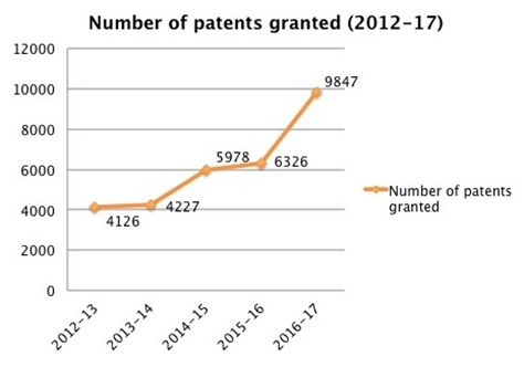 The increase in examination also came with an increase in the number of patents granted. The granting of patents witnessed a growth of 138.6% from 2012 to 2017. In 2012, the number of patents granted were 4,126 while in 2016-17, 9,847 patents were granted.