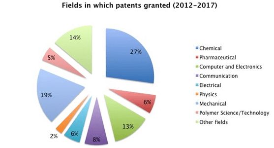 Consistently, the chemical field has had the largest share in the number of patents granted from 2012-2017 while fields such as bio-medical and agriculture engineering have had negligible shares (and thus clubbed together with other fields).