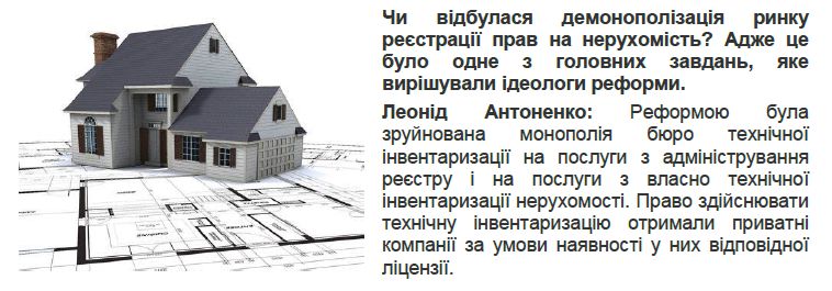 Леонід Антоненко: Маю на увазі процес наповнення нового реєстру інформацією про об'єкти нерухомого майна і речових прав на них. Закон покладає на власників майна тягар цього наповнення. Для того щоб інформація була перенесена з старого реєстру БТІ до нового реєстру підпорядкованого Укрдержреєстру, власник майна повинен зібрати пакет документів і особисто подати його до Укрдержреєстру. В умовах хаосу, який супроводжував початок роботи новостворених відділень Укрдержреєстру, недивно, що перенесення інформації між реєстрами перетворилося для власників нерухомості в жахливий бюрократичний марафон, яким здебільшого і запам'ятався початок реформи.