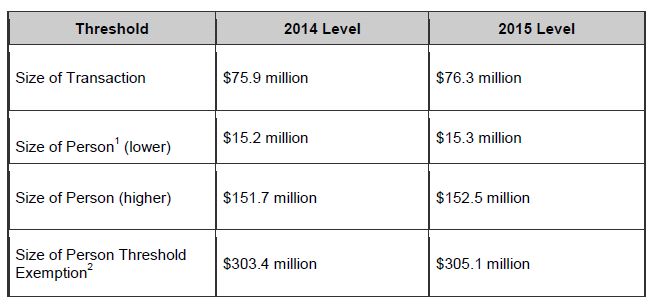 The HSR Act sets forth two primary notification thresholds: the size of transaction threshold and the size of person thresholds. These thresholds have been revised for 2015 as follows:
