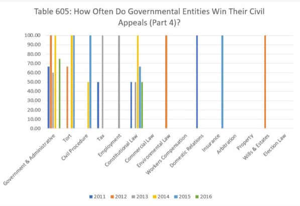 In 2013, governmental entities won both their tax law cases and both their employment law cases. They won three of five cases in government and administrative law, for a winning percentage of 60%. They hit .500 in constitutional law cases, winning one of two, but lost single cases in civil procedure and workers compensation. The court didn't hear many cases initiated by governmental entities in 2014. The government won single cases in government and administrative law, tort law and constitutional law, while splitting their two cases involving civil procedure.
