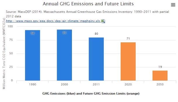 As indicated in the bill's title, the Administration would encourage the Commonwealth's distribution companies to source hydropower as a way of meeting the state's required greenhouse gas emission reductions under Global Warming Solutions Act. Signed into law by Governor Baker's predecessor Deval Patrick, the Global Warming Solutions Act requires the Massachusetts to reduce its greenhouse gas emissions 25% below 1990 levels by 2020. A 2014 report by the Massachusetts Department of Environmental Protection noted that emissions in the state had been reduced 15% from 1990 levels.