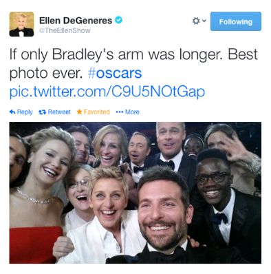 Now the legal plot thickens. Who actually owns the copyright to the picture that was taken and posted? First, we know that even though the photo was taken with a Samsung promotional camera given to Ellen for the event, Samsung has denied ownership rights to the picture. We also know there is strong legal precedent for the copyright belonging to Bradley Cooper. After all, he took the photo, and under traditional principles of authorship under copyright law, the owner of a copyright is the author of the work. In the case of photos, the author is usually the person who snaps the shutter and takes the picture. Indeed, Ellen's tweet acknowledges that Bradley took the photo. To add to the fun, Twitter's copyright page notes that: "In general, the photographer and NOT the subject of a photograph is the actual rights holder of the resulting photograph." Maybe Ellen and Bradley should be co-authors and co-owners?