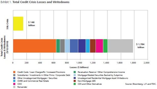 2. The total credit losses and writedowns are from Bloomberg, L.P. as of 12 May 2010. US GDP for 2009 was $14.3 trillion in current dollars according to the Bureau of Economic Analysis.