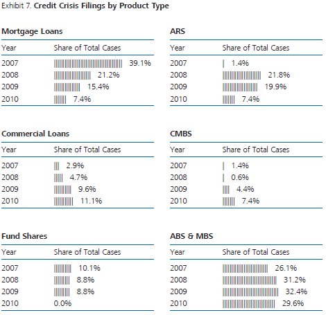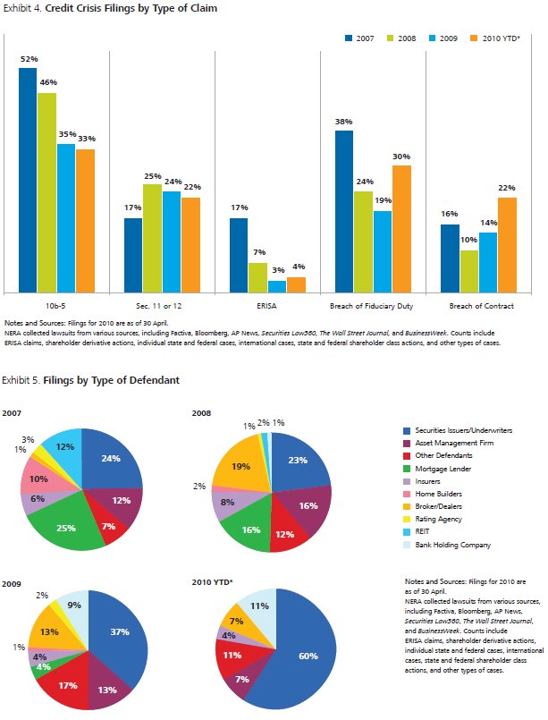 There has been a noticeable shift in the type of defendants as the credit crisis has progressed. In 2007, mortgage lenders, home builders, and REITs were named as defendants in 47% of filings. In 2008, mortgage lenders, home builders, and REITs were named in only 20% of filings. This decreased to just 5% in 2009 and so far in 2010 we have not recorded any filings against this group of defendants yet.