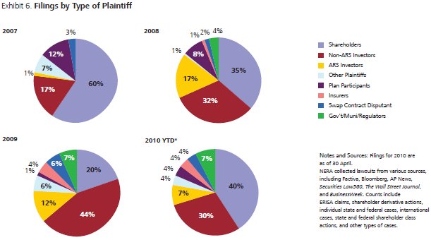 Additionally, shareholder suits declined in 2008 and 2009, but have experienced an uptick in 2010. For the year through 30 April 2010, shareholder suits have represented approximately 40% of all lawsuits, though this number is influenced by seven separate shareholder derivative and class action claims filed against Goldman Sachs in April regarding synthetic CDOs.