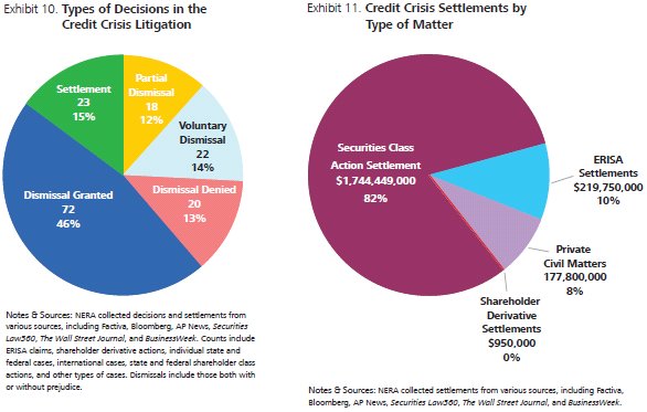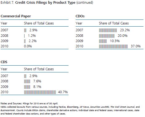 While the credit crisis lawsuits are being filed at a slower pace than in previous years, the current lawsuits are now focused on structured products and derivatives, and we expect similar suits in light of the SEC case against Goldman Sachs in April 2010 involving synthetic CDOs. Also, as many of the early lawsuits against lenders and brokers work their way through the system and lawsuits involving structured products continue to be litigated, settlements and judgments will be the next chapter in this story as they will surely impact the current financial and economic landscape.