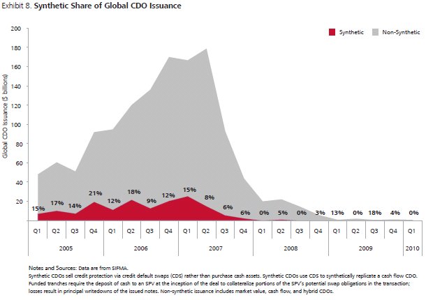 Synthetic CDOs, a type of collateralized debt obligation where the underlying collateral is a portfolio of CDS, have not exceeded 21% of global CDO issuance in any quarter since 2005. In fact, total synthetic CDO issuance from 2005 through 2009 was $161.0 billion, approximately 12% of the $1.3 trillion total CDO issuance globally in the same time period. Exhibit 8 below illustrates global issuance of synthetic CDOs relative to all CDO issuance quarterly. The allegations in the synthetic CDOs lawsuits include alleged failures of appropriate disclosure regarding CDS counterparties with "economic interests directly adverse to investors" and intentional or reckless misrepresentation of offering documents including term sheets and offering memorandums.13
