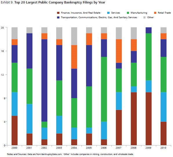 Another recent trend is the rise in businesses declaring bankruptcy since 2007 and the relative increase in the share of financial companies filing for bankruptcy in the wake of the crisis and recession.14 We analyzed the 20 largest public company bankruptcies in each year between 2000 and 2010.15 Among those filings, financial, insurance, and real estate companies never made up more than two in any year between 2001 and 2006 inclusive. However, in 2007, 2008, and 2009, financial, insurance, and real estate companies accounted for six, nine, and nine of the 20 largest bankruptcies in those years, respectively. Many of these companies included real estate investment trusts like General Growth Properties, as well as savings and loan institutions like Washington Mutual and IndyMac Bancorp. The breakdown of the top 20 largest public company bankruptcies by sector and year is shown in Exhibit 9.