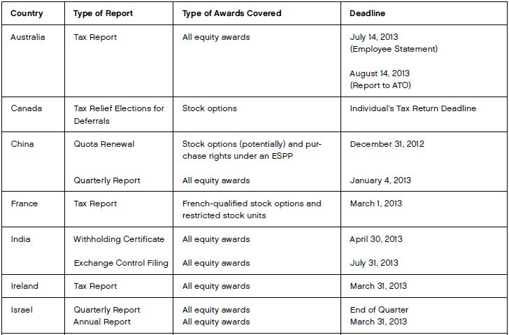Exercises of stock options, vesting of RSUs, and ESPP purchases are subject to these new reporting requirements. These filings on forms published by the Japanese government must be made with respect to any exercises or payments that occur on or after January 1, 2012 by March 31 of the calendar year following the year in which the exercise or payment occurred. The first filings will be due March 31, 2013.