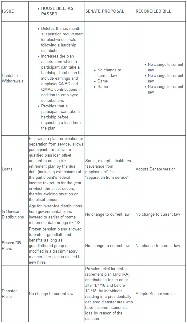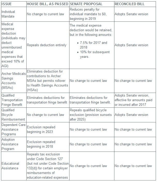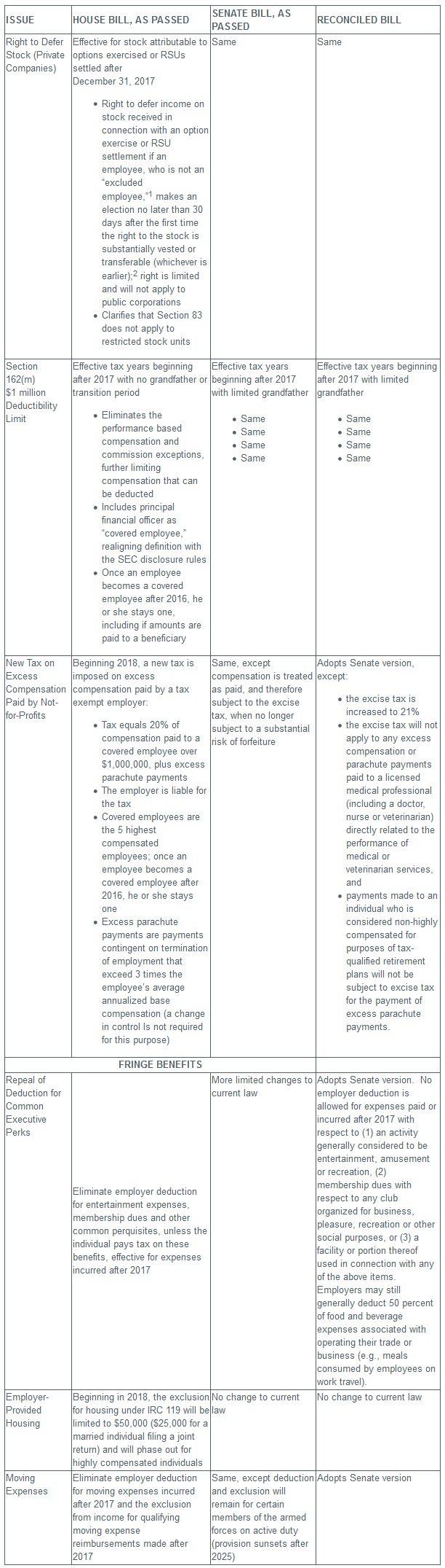 As we've previously reported, the Bill's impact on employee benefits and executive compensation were greatly diminished as the Bill wound its way through Congress (see our previous alerts, Issue #1, Issue #2 and Issue #3). Nonetheless, the Bill does make some important and material changes in this area. The following table updates our prior summaries by providing the highlights of the final Bill, as compared to the earlier versions of the House Bill and Senate Bill.