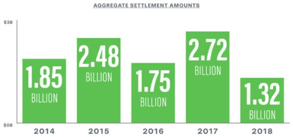 Considering all types of workplace class actions, settlement numbers in 2018 totaled $1.32 billion, which decreased significantly from 2017 when such settlements totaled $2.72 billion and in 2016 when such settlements totaled $1.75 billion.