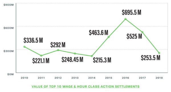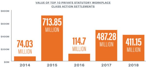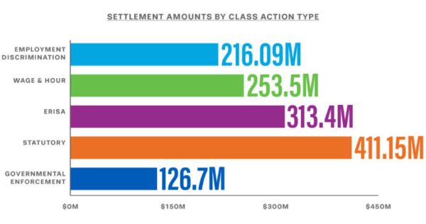 In 2018, there was a significant downward trend for the value of settlement of ERISA and wage & hour class action settlements, as well as for government enforcement lawsuits. In addition, there were significant decreases across-the-board for resolutions of class actions involving employment discrimination claims and statutory workplace laws. By any measure, class action recoveries were down.