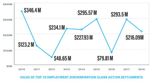 In 2018, the value of the top ten largest employment discrimination class action settlements of $216.09 million was the fourth lowest figure since 2010, and largely aligned with the trend that started in 2011 (after Wal-Mart was decided) that showed decreases in settlement amounts over three years of that four-year period.