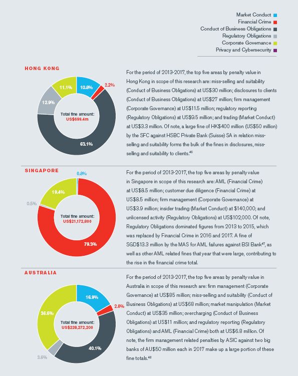 Despite the drive from regulators to promote individual accountability, there is a similar declining trend globally in the fine amounts against individuals from 2016 to 2017, and this trend looks set to continue for 2018. When we look at individual jurisdictions, however, these vary widely, with the U.S., Europe (excluding the UK) and Hong Kong having increased fine amounts; this is despite, except for Europe, a decline in number of fines.