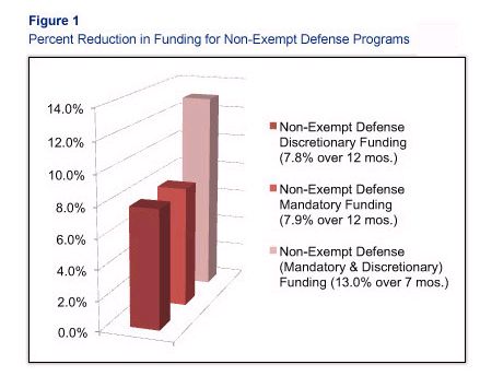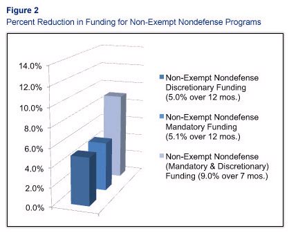The Office of Management and Budget (OMB) estimates that the effective percentage reductions are approximately 8 percent in funding for non-exempt defense programs (mandatory and discretionary alike), and 5 percent in funding for non-exempt nondefense programs (mandatory and discretionary alike). However, because these cuts must be achieved over the seven months remaining in fiscal year 2013 (rather than a full fiscal year), the OMB estimates that the effective percentage reductions will be approximately 13 percent for non-exempt defense programs and 9 percent for non-exempt nondefense programs.