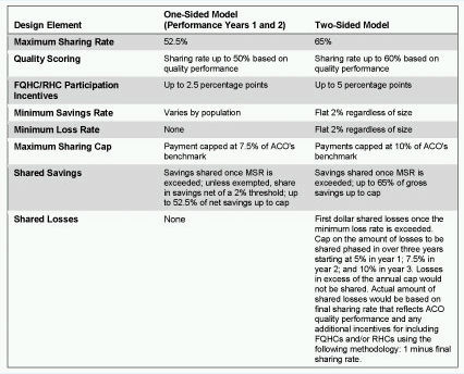 CMS proposes to give ACOs the option of participating in either a one-sided risk model (i.e., sharing savings for the first two years, then sharing savings and losses in the third year) or a two-sided risk model (i.e., sharing savings and losses for all three years). ACOs participating in the one-sided model would be facing less risk, but ACOs participating in the two-sided model would be eligible for a greater share of the savings. Specifically, ACOs in the two-sided model will be eligible to share up to 60 percent of savings, while ACOs in the one-sided model will be eligible to receive up to 50 percent of savings.