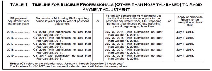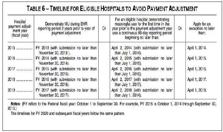 The following table from the Stage 2 Rule shows how an EH may avoid the payment penalties by demonstrating MU during the EHR reporting period two years prior to the payment adjustment year or for an EH demonstrating MU for the first time in the year prior to the payment adjustment year, a 90-day reporting period beginning no later than April 2 of the prior year.