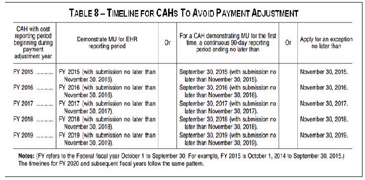 The following table from the Stage 2 Rule shows how a CAH may avoid the payment penalties by demonstrating MU during an EHR reporting period that is the same as the payment adjustment year or, for a CAH demonstrating MU for the first time in the payment adjustment year, a 90-day reporting period beginning no later than September 30 of such payment adjustment year.