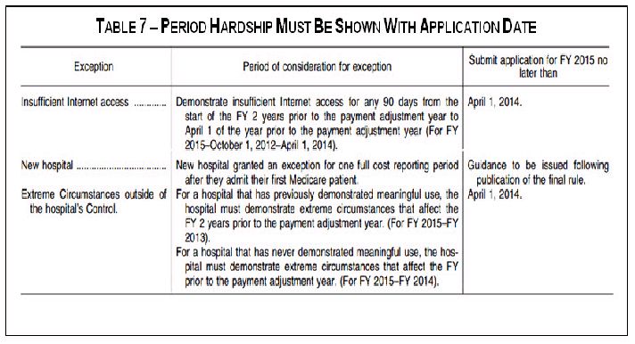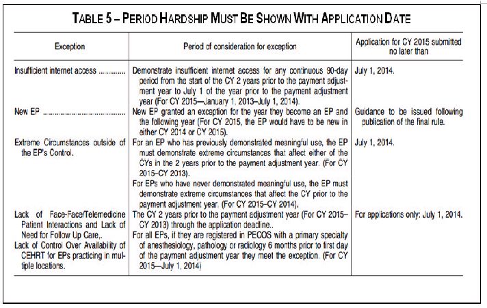 The Stage 2 Rule establishes four hardship exceptions to the payment penalties for eligible providers based on (ii) the lack of availability of internet access or barriers to obtaining IT infrastructure; (ii) a time-limited exception for newly practicing EPs or new hospitals that will not otherwise be able to avoid payment adjustments; (iii) unforeseen circumstances such as natural disasters; and (iv) for EPs only, exceptions due to a combination of clinical features limiting a eligible provider's interaction with patients or, if the EP practices at multiple locations, lack of control over the availability of CEHRT at practice locations constituting 50 percent or more of their encounters.