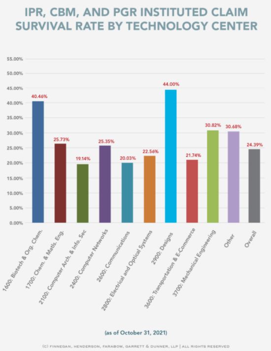 The overall cumulative instituted claim survival rate in IPRs, CBMs, and PGRs, broken down by technology center, is as follows: