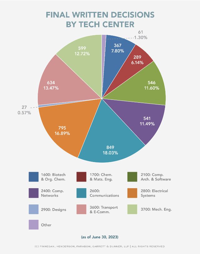 The cumulative number of Final Written Decisions through June 30, 2023, separated by technology center, is as follows: