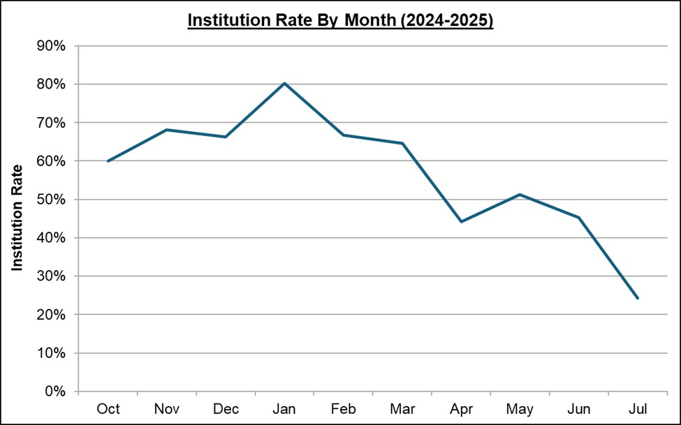 The institution rate has dropped significantly over the past year due in part to an increase in discretionary denials since the start of the bifurcated review process in May.