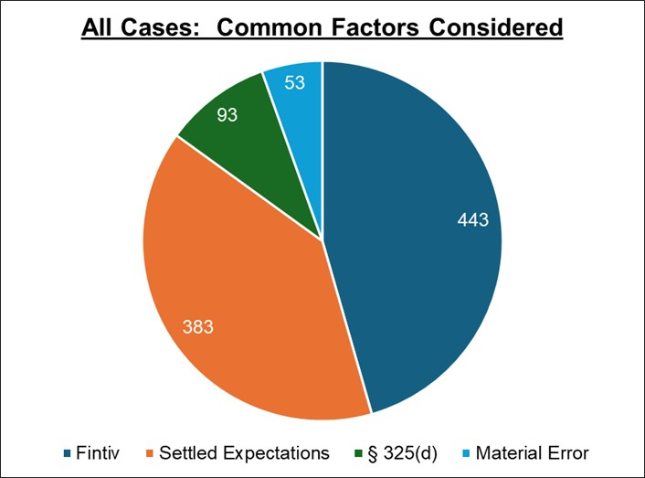 Fifty-nine percent (188/319) of denials were based on Fintiv. The settled expectations of the patent owner favored denial in 60% (190/319) of denials, two cases more than Fintiv. Meanwhile, § 325(d) (whether the same or similar prior art or arguments were previously presented) weighed against the petitioner in nine denials (3%). In five denials (2%), the Deputy Director explicitly found that there was no material error during prosecution. An additional factor that commonly favors denial, when applicable, is whether the patent was (or is being) challenged in prior (or ongoing) proceedings, such as district court litigations, IPRs, or ex parte reexaminations.
