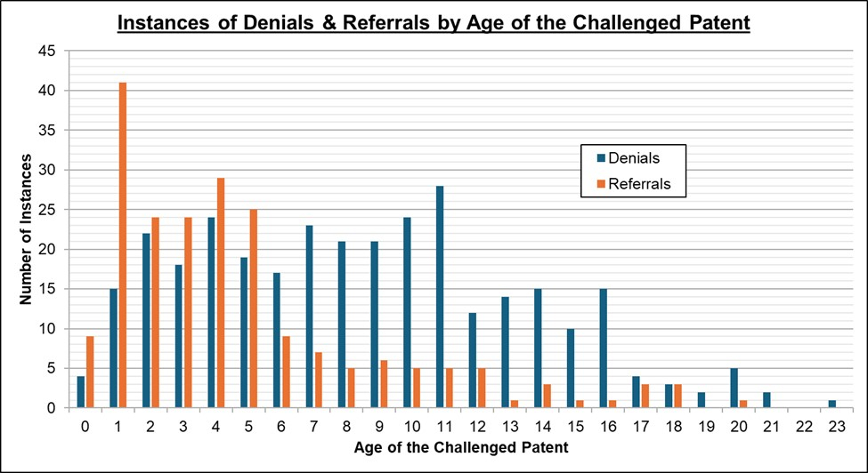 As shown above, settled expectations is the most common factor that favors denial in a discretionary denial. Settled expectations depends heavily on the age of the challenged patent. The following graph depicts discretionary denial success as related to the age of the challenged patent. While each petition challenges one patent, the same patent is sometimes challenged by serial petitions. Each challenge counts as one data point, so if a patent was challenged twice, both challenges are represented in the graph. Thus, successful and unsuccessful challenges to the same patent are counted. Each patent's age is also rounded down to the nearest full year (e.g., a 5-years-and-11-months-old patent is considered 5 years old).