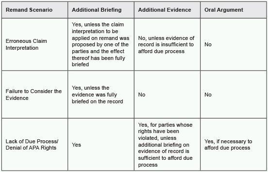 Appendix 2 of SOP 9 provides guidance to the parties and considerations for determining the scope of remand, including under what circumstances additional briefing, additional evidence or another oral argument would be permitted. A short summary of some common remand scenarios is provided in the table below.