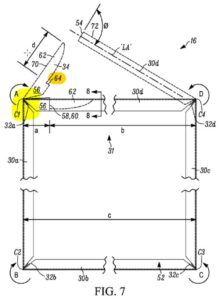 The construction of the term "stop" was particularly important to the outcome of this proceeding. The PTAB adopted the construction of "stop" proposed by the Petitioner in its petition, and which was not challenged by the Respondent—"a physical abutment that prohibits movement of the adjoining structure beyond a predetermined location." Whereas conventional spacer frames form a seam at the corner of the frame (area highlighted in yellow in the figure below), this practice often led to water vapor infiltrating the window through the corner. To combat this problem, the claimed invention was structured so that the seam was positioned away from the corners, and it utilized a stop, also positioned away from the corner, to form the union point between the two ends of the frame, (stop 64 highlighted in orange below).