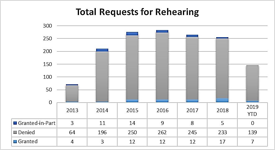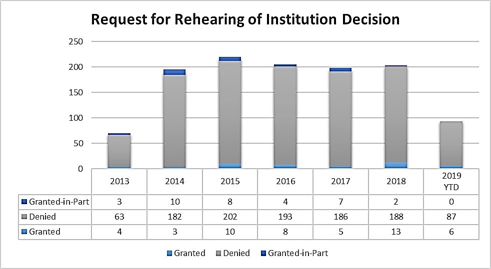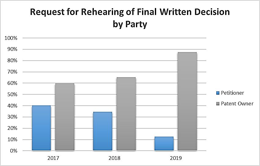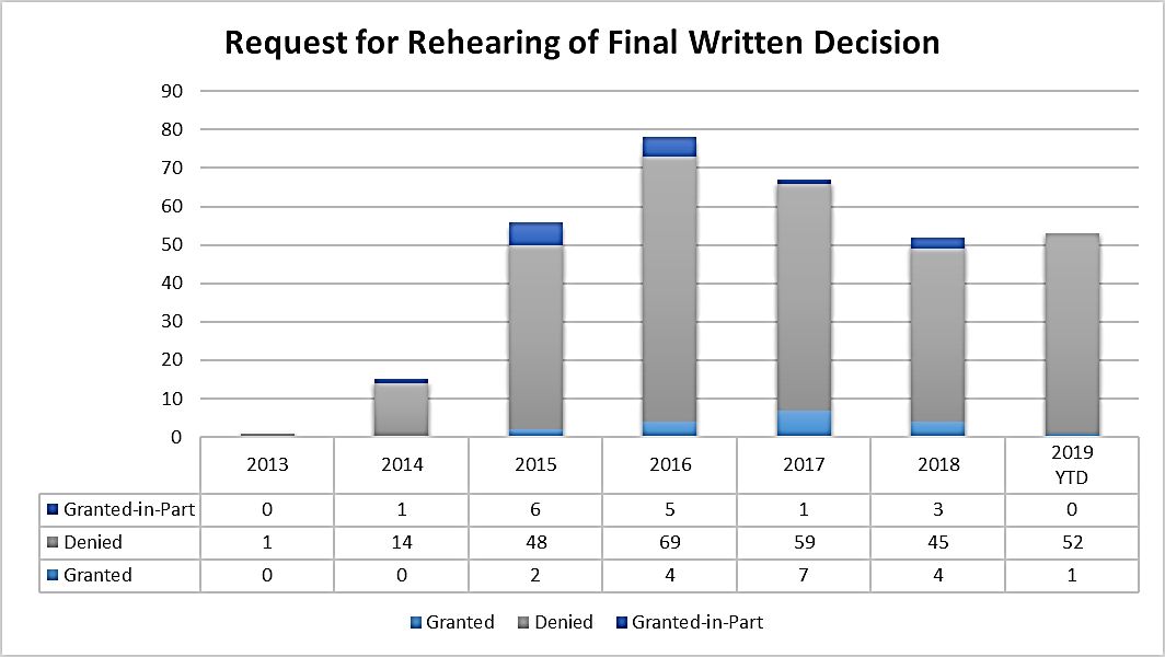 The slightly higher success rate of requests for rehearing of final written decisions makes some logical sense. The purpose of rehearing is to "identify all matters the party believes the Board misapprehended or overlooked, and the place where each matter was previously addressed in a motion, an opposition, or a reply" (37 C.F.R. § 42.71), and there's simply more matter that the Board could have "misapprehended or overlooked" when it is working with a complete record rather than just a petition and preliminary response. Of course, the comparatively higher grant rates of requests for rehearing of final written decisions in 2017 and 2018 have not held for 2019 thus far, so we may be in the midst of a down trend. Given the meager grant rates overall, practitioners should consider whether requesting rehearing is worth the time, effort, and expense after receiving a negative initial or final written decision.