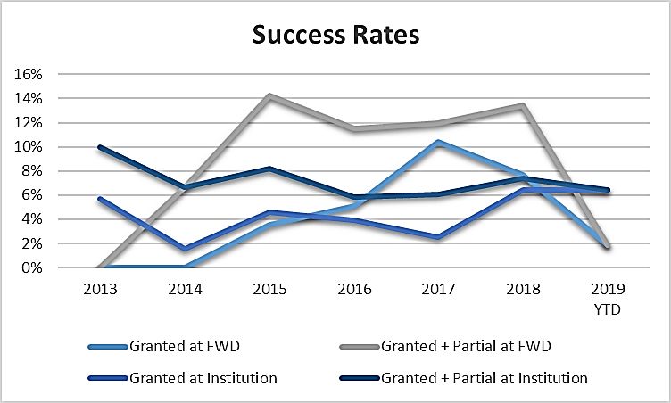 It's easy to look at these numbers and be discouraged, as the denial rate has consistently remained around 90% or higher. But if the requests are broken down further into those involving institution decisions and those involving final written decisions, some more nuanced trends can be seen.