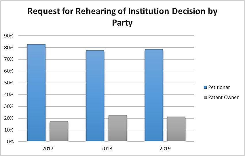 With this disparity between the parties' preference for filing after institution (petitioner) versus after final written decision (patent owner) in mind, we have also studied historical rehearing decisions to determine whether there was a noticeable difference in outcomes depending on which party was seeking the rehearing. However, with respect to requests for rehearing, the PTAB appears to be fairly uniform with its treatment of petitioners and patent owners. A review of the last 3 years' worth of rehearing decisions reveals no major difference in outcome regardless of whether a patent owner or petitioner was requesting rehearing. While petitioners were somewhat more successful than patent owners in 2018, patent owners saw a greater number of granted requests in 2017, and there has been no significant difference thus far in 2019.