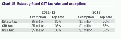 The favorable new transfer tax rates aren't built to last. Beginning in 2013, the transfer taxes are scheduled to revert to the rules in place in 2000 (see Chart 15). Legislation is likely in this area, so check with a Grant Thornton tax professional for an update.