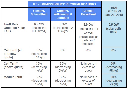 Under Section 201 of the Trade Act of 1974 (the statute under which Suniva brought its petition), the President has authority to accept, reject or modify the ITC Commissioners' recommendations. Here, the White House appears to have adopted the "middle road" recommendations jointly made by Commissioners Williamson and Johnson: